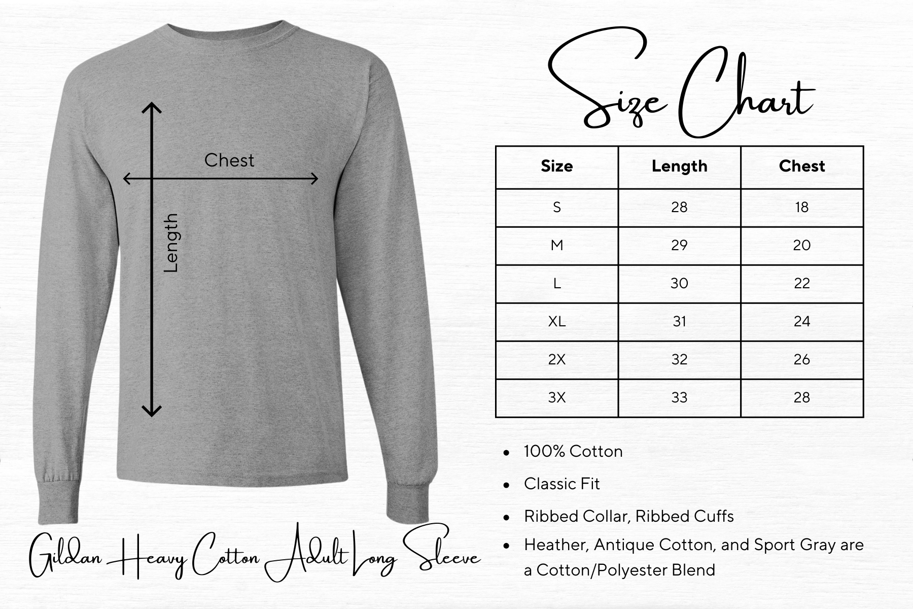 Note: Long sleeve tee will be printed on Gildan Ultra Cotton. Sizing is the same as Heavy Cotton size chart.