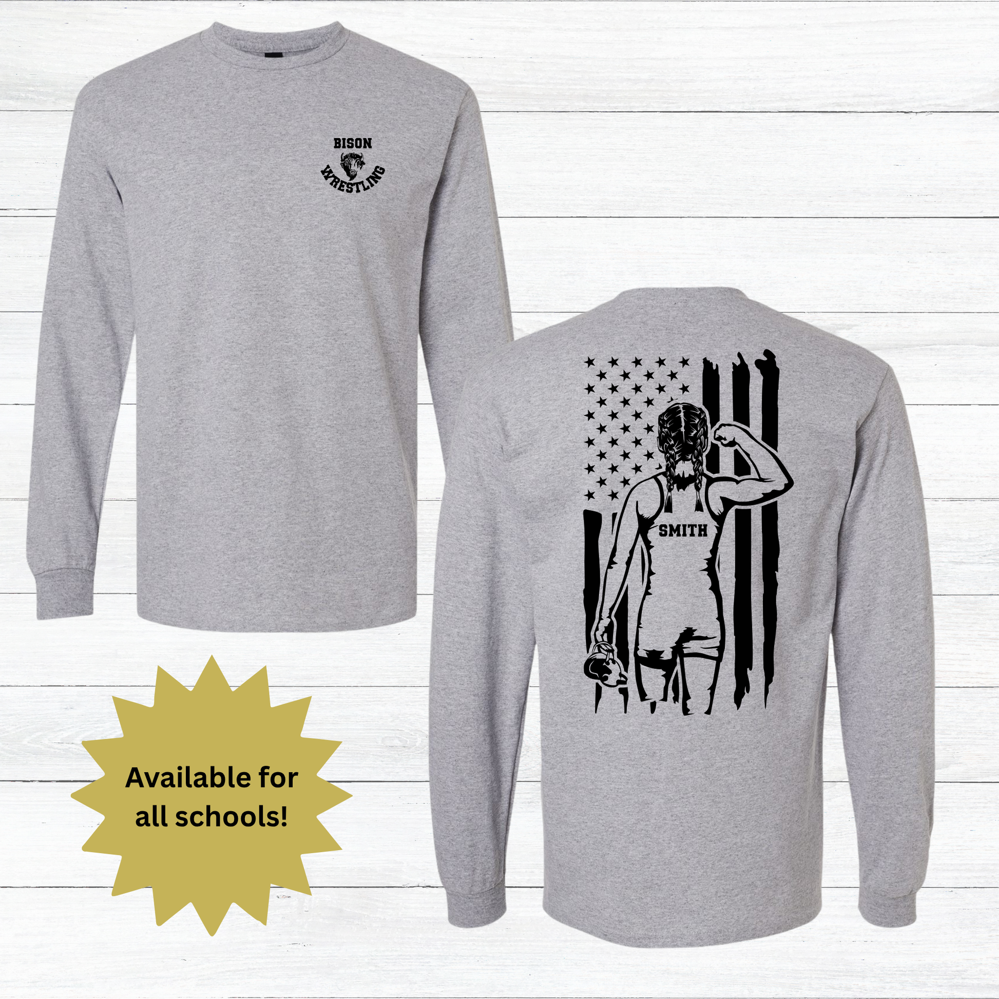 Show your pride on and off the mat! This bold tee features a female wrestler in front of the American flag — a perfect mix of strength and spirit. Add your name for a personalized touch that makes it 100% yours.