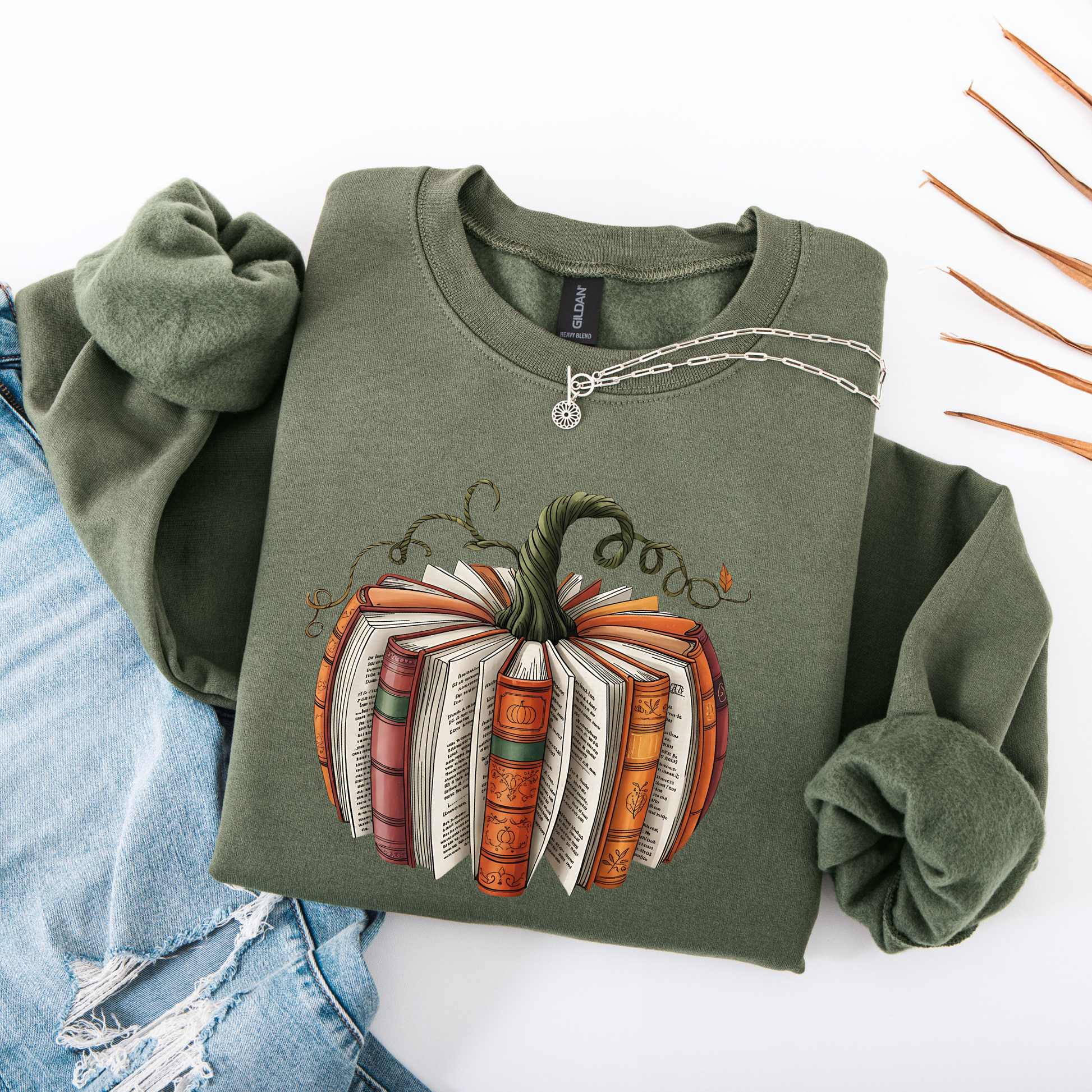 Where cozy season meets story season 🍂 Our Story Season crewneck brings together two autumn essentials — books and pumpkins — in one perfectly bookish design. Featuring a beautifully detailed stack of vintage novels forming a pumpkin, this sweatshirt is made for crisp mornings, candlelight reads, and fall festivals at the library.