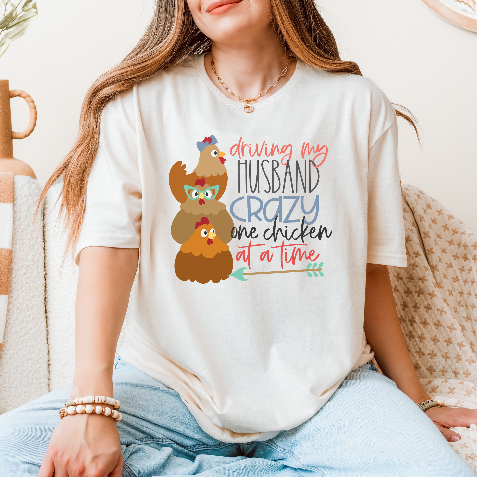 If your flock is more than just a hobby—and your husband knows it—this shirt was made for you! Featuring the playful phrase “Driving My Husband Crazy One Chicken at a Time,” this tee is perfect for backyard chicken keepers, farm wives, and poultry lovers with a sense of humor.