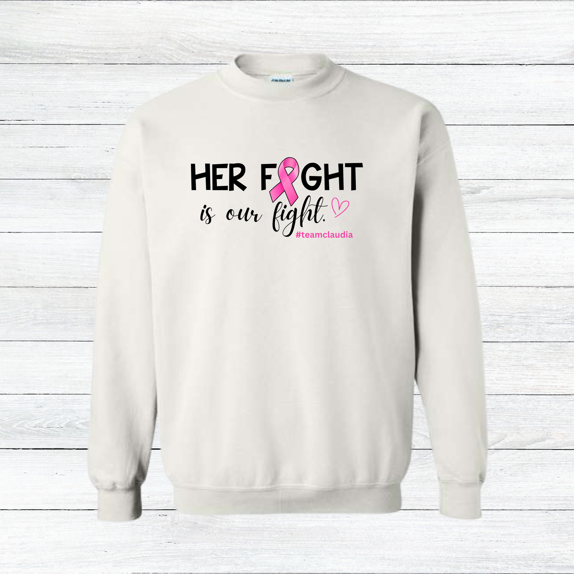 Created in support of Claudia, this “Her Fight Is Our Fight” crewneck is more than a shirt—it’s a statement of unity, strength, and love. It shows that her fight is a shared fight, and she has a whole community behind her.
