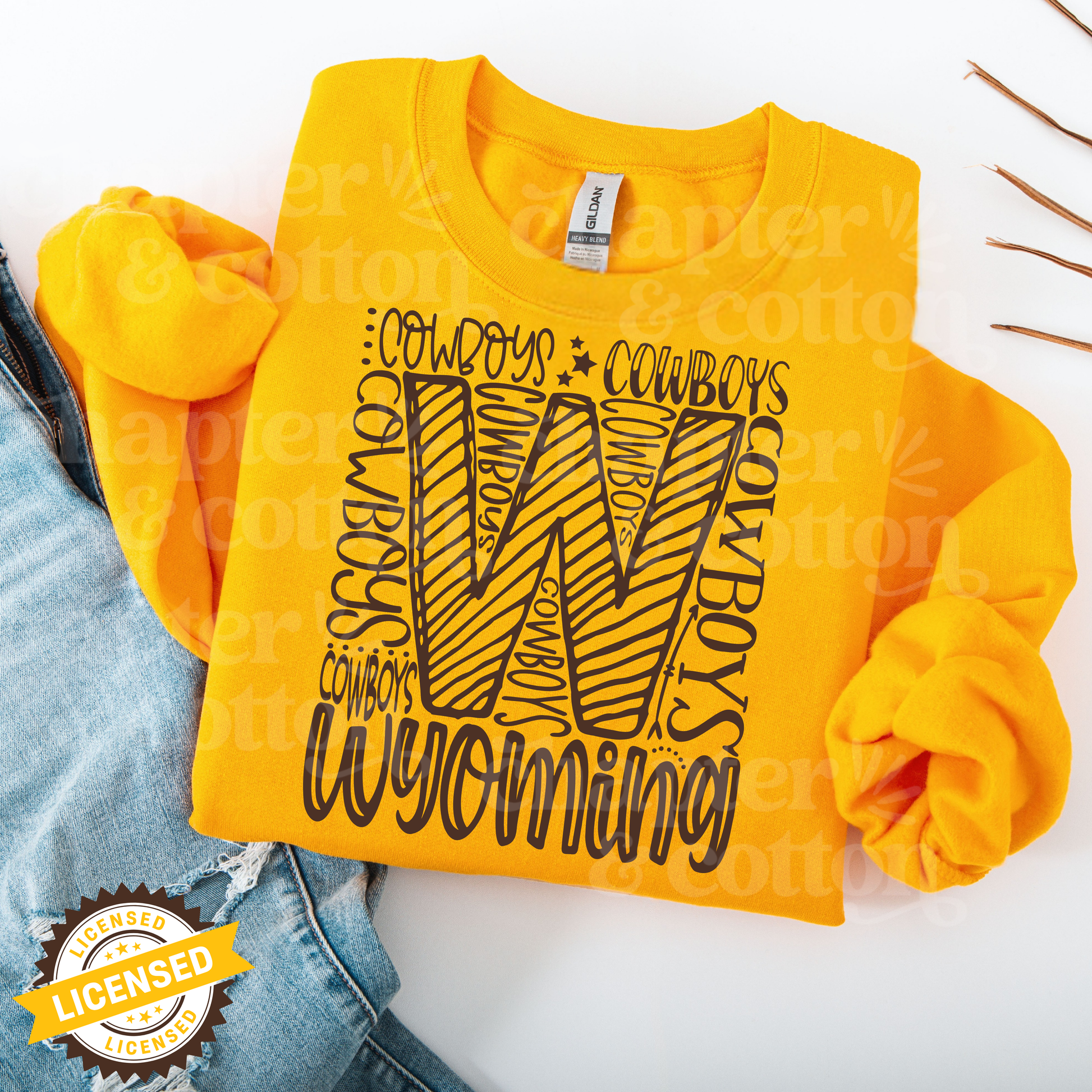 Show off your Wyoming pride in bold, hand-lettered style with our Cowboy Sketches design. 💛🤎 Featuring a playful mix of fonts and the word “Cowboys” woven throughout a large statement “W,” this design captures the playful and energetic spirit of the Brown and Gold.